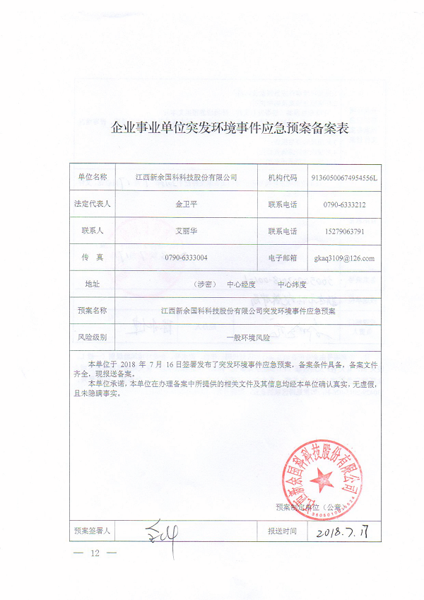 江西新余國科科技股份有限公司突發(fā)環(huán)境事件應(yīng)急預(yù)案備案表