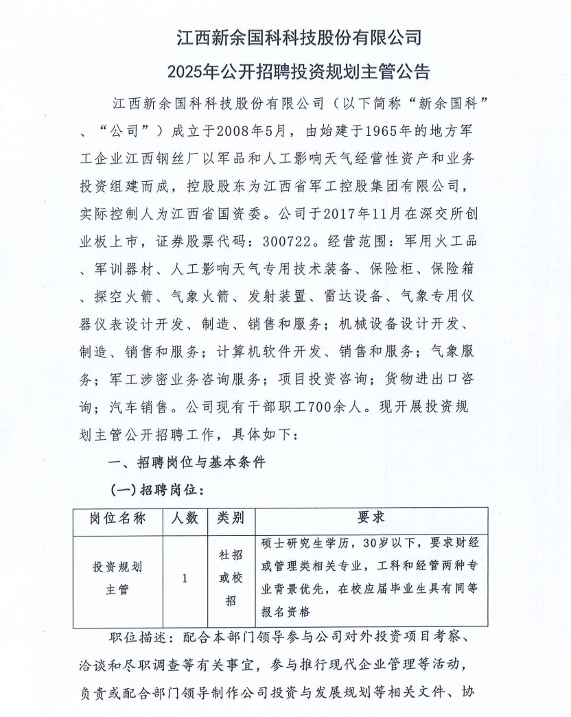 江西新余國科科技股份有限公司 2025年公開招聘投資規(guī)劃主管公告